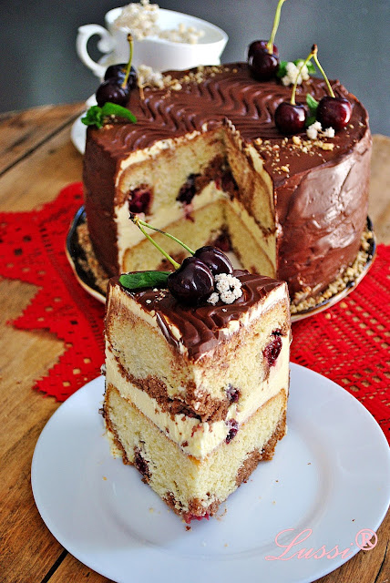 Днес обаче, като една лека интродукция към тортената фиеста, която започнах последно време, ще ви споделя и чудесна торта от книгата ми със София мел, която ко-създадохме с Таня Донева. Сезонът на черешите е тук и аз вече преядох неколкократно с тях - кихам, носа ми тече, сърбят ме очите от алергията и пак ги ям. Виж, в торта пък, още повече ми понася, макар че във фитнеса е точни обратното, Няма да обръщам внимание на това обаче, защото може ли човек да мърмолясва, когато има пред себе си такава красота.Надявам се моето предложение да ви е от полза, а ако искате да виждате повече такова авторско, позитивно и българско съдържание в нета, знаете как да ми го показвате - споделяйте, коментирайте, гответе и ме последвайте ме в Инстаграм тук - https://www.instagram.com/lussievtimova/ за повече тайни от кухнята ,